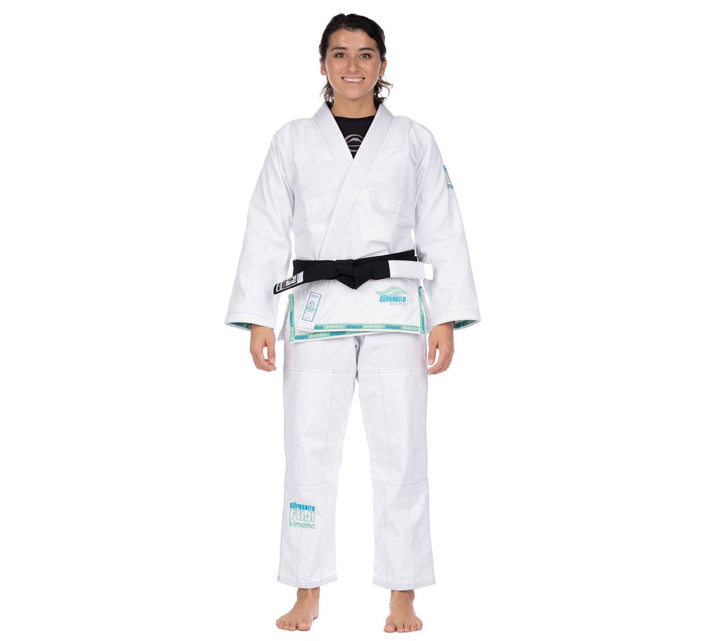 This gi's design features contrast Stitching on Jacket & Pants, a Suparaito logo on the jacket, skirt, and pants. FUJI logos on Sleeve, Back of Neck, and Pants. Lastly, and outside taping on the skirt.