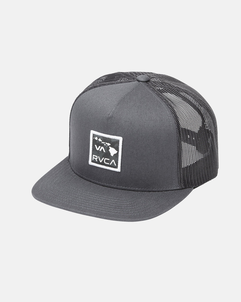 The RVCA Islands Patch Trucker Hat is a deep fit trucker hat with a front merrowed edge Hawaii islands patch and a RVCA flag label at the back.