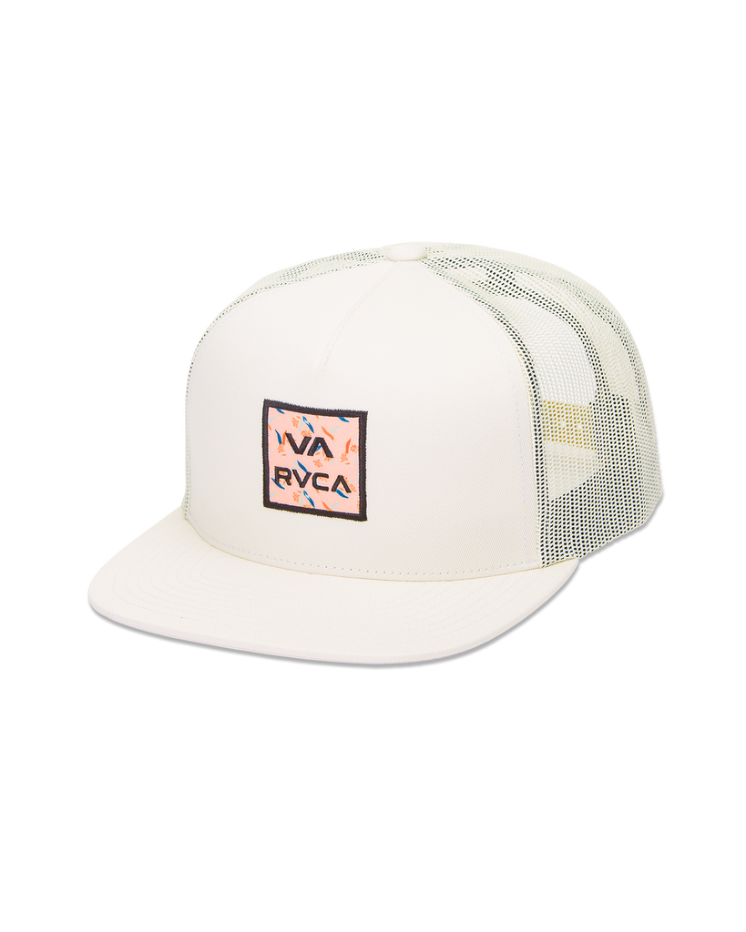 Twill fabrication front with mesh back panels.  Mid fit single front panel snapback.  Structured front.  Printed patch with embroidered RVCA logo.  Printed interior taping.  RVCA woven flag label at snap.  Interior woven fit label.